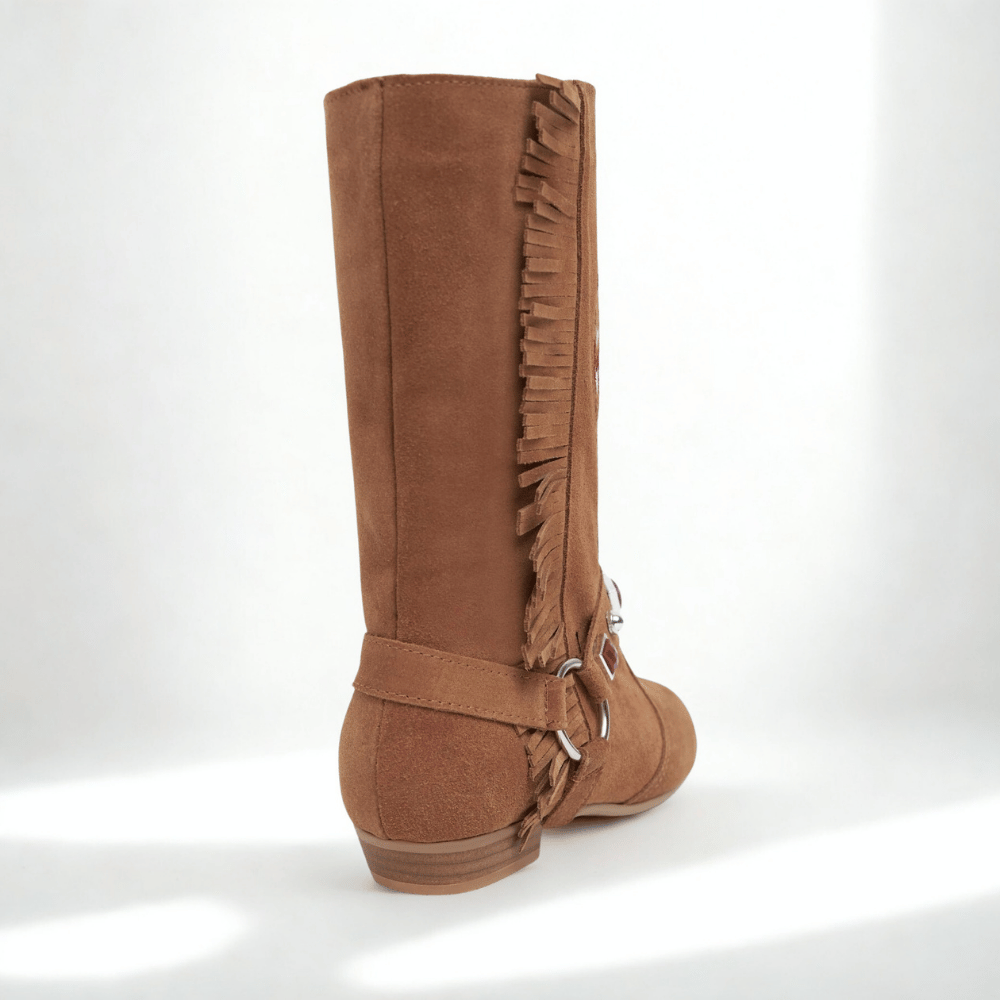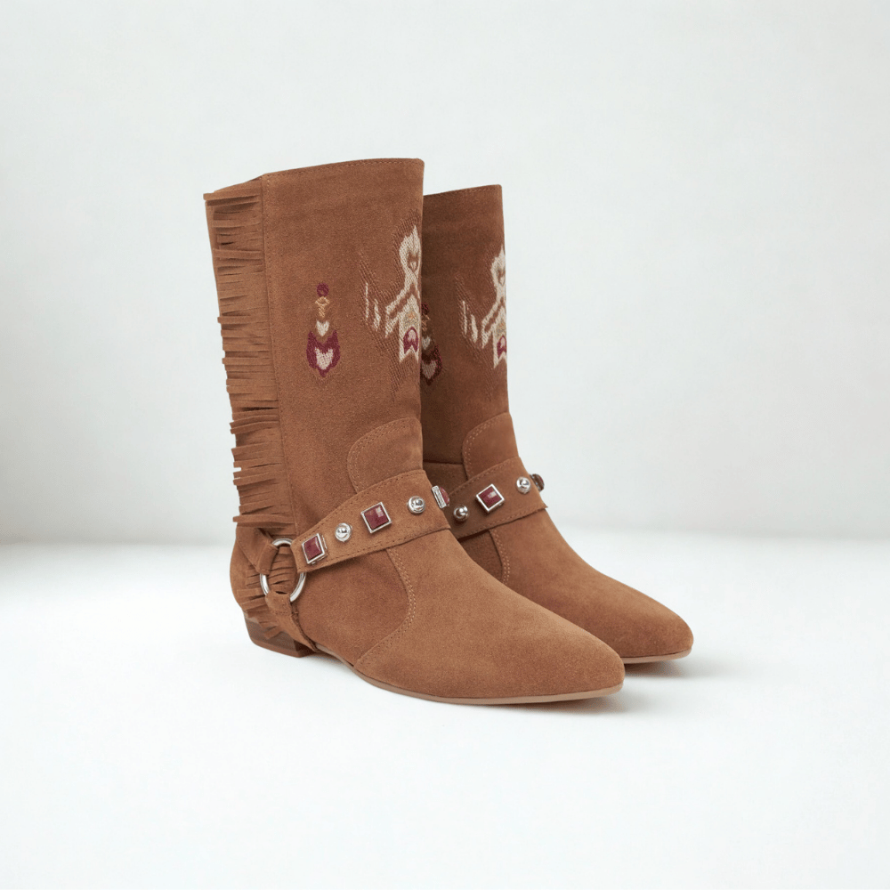 ASTRID: Avrupa stilinin kusursuz başyapıtı. Titizlikle seçilmiş hakiki süet ve el nakışı zarafetiyle kış modasına imza atın. Özgür ruhlu tasarımı ve konforlu düz tabanı, her adımınıza lüks bir dokunuş katacak.